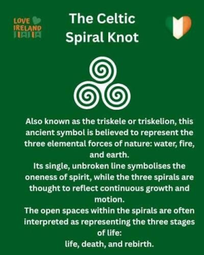 The Triskel symbol has various meanings in Irish culture. Some people believe that the three spirals represent the three elements of earth, water, and air.
