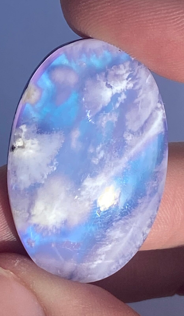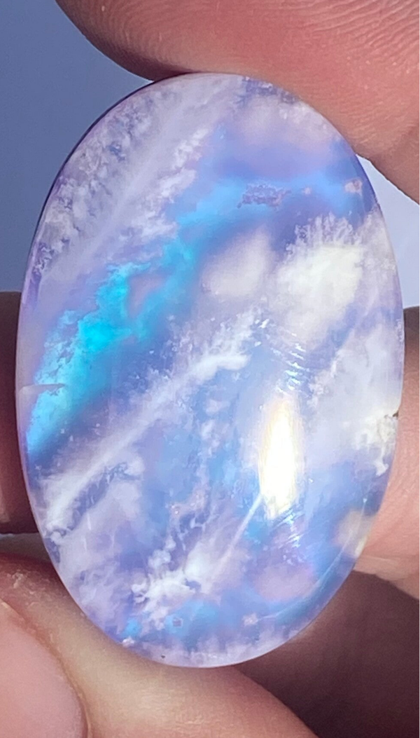 Plume Agate is a natural stone featuring feather-like inclusions that resemble smoke, clouds, or drifting feathers. Backed with Aurora effect, each piece shimmers with a striking iridescence, evoking the beauty of a luminous sky. Expertly crafted by a professional lapidary artist and their skilled team, every stone is cut and finished to the highest standards. Each piece is personally hand-selected, ensuring both quality and uniqueness.