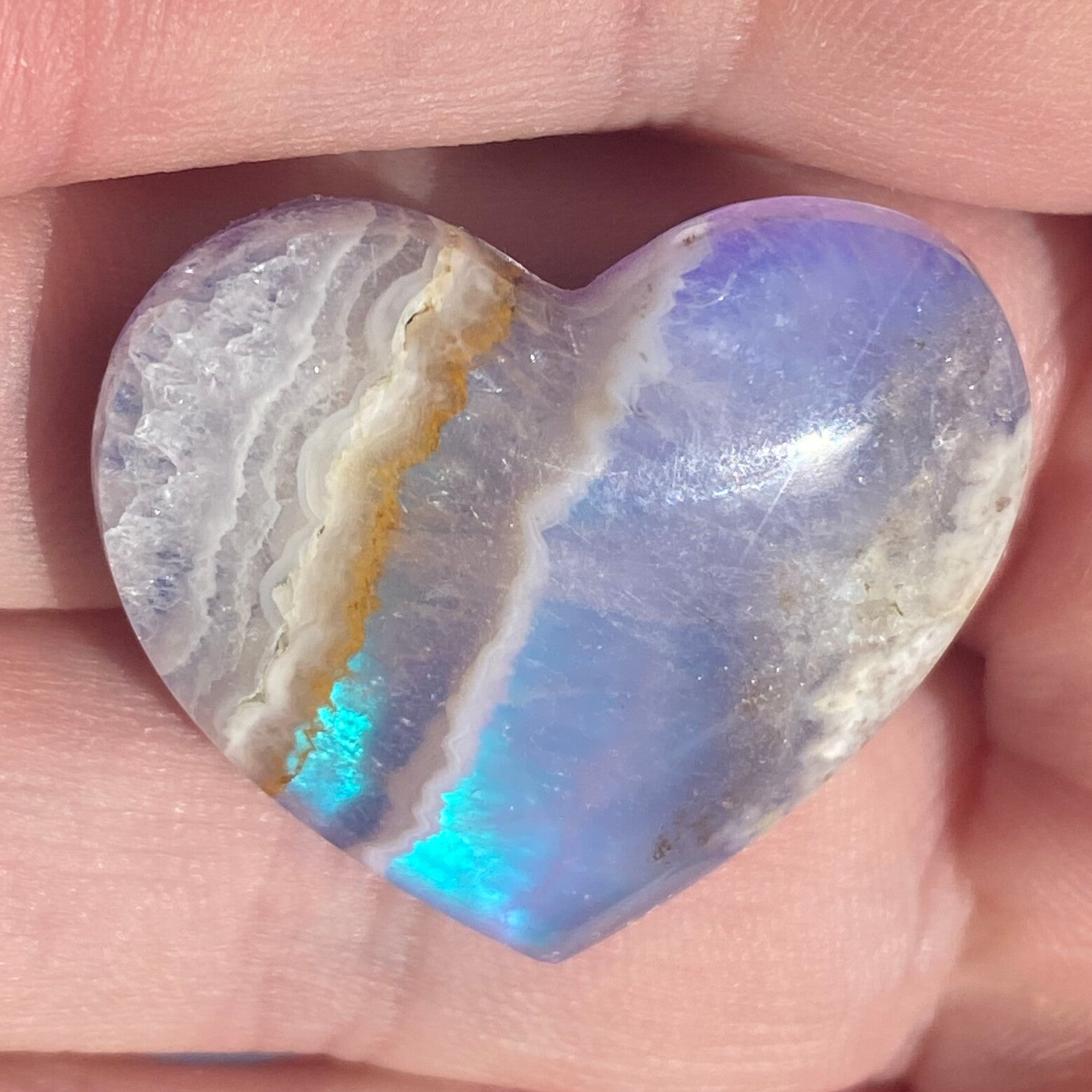 This Sky agate is a banded chalcedony, a variety of agate, This crystal is often characterized by its banded patterns, which can vary in intensity and texture.Backed with Aurora effect, each piece shimmers with a striking iridescence, evoking the beauty of a luminous sky or sea shore. Expertly crafted by a professional lapidary artist and their skilled team, every stone is cut and finished to the highest standards. Each piece is personally hand-selected, ensuring both quality and uniqueness.