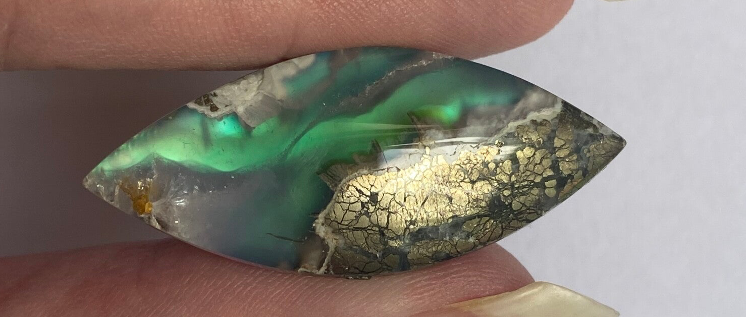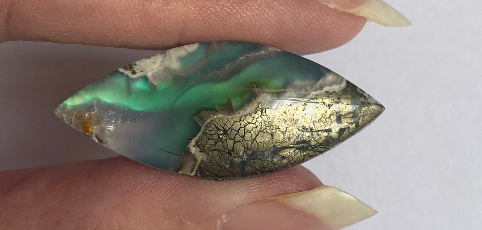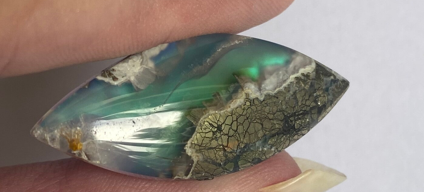 This rare Marcasite is a natural stone with a brilliant metallic luster, Backed with Aurora effect, each piece shimmers with a striking iridescence, evoking the beauty of a luminous ocean . Expertly crafted by a professional lapidary artist and their skilled team, every stone is cut and finished to the highest standards. Each piece is personally hand-selected, ensuring both quality and uniqueness.