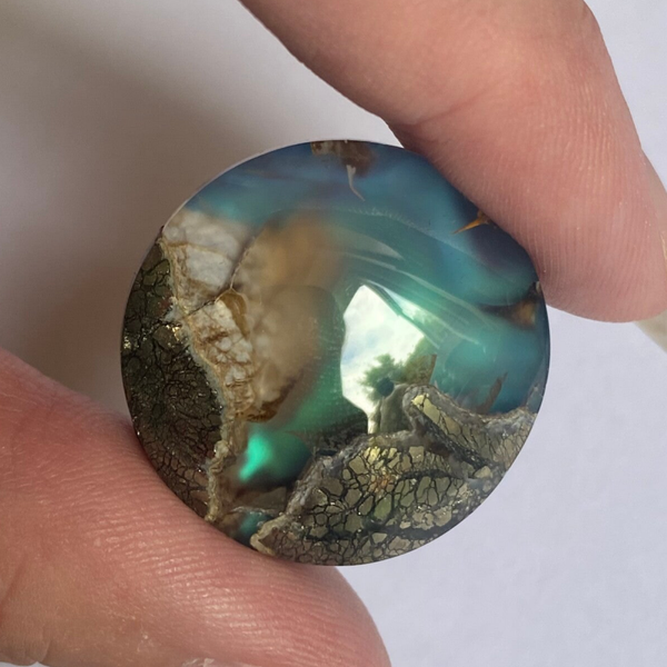 This rare Marcasite is a natural stone with a brilliant metallic luster, Backed with Aurora effect, each piece shimmers with a striking iridescence, evoking the beauty of a luminous ocean . Expertly crafted by a professional lapidary artist and their skilled team, every stone is cut and finished to the highest standards. Each piece is personally hand-selected, ensuring both quality and uniqueness.