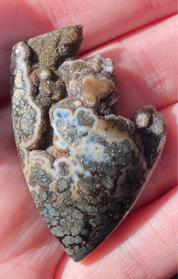 This striking, one-of-a-kind cabochon features natural black marcasite druzy with stunning botryoidal crystal formations and delicate flower-like patterns. The stone has been sculpturally cut to showcase its unique texture and sparkle,perfect for a statement pendant or for collectors of rare mineral specimens. Expertly crafted by a professional lapidary artist and their skilled team, every stone is cut and finished to the highest standards. Each piece is personally hand-selected, ensuring both quality and uniqueness.