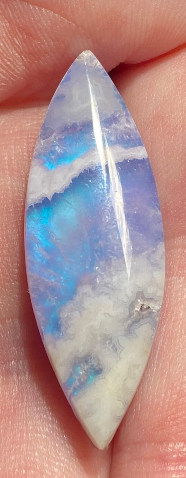 This Sky agate is a banded chalcedony, a variety of agate, This crystal is often characterized by its banded patterns, which can vary in intensity and texture.Backed with Aurora effect, each piece shimmers with a striking iridescence, evoking the beauty of a luminous sky or sea shore. Expertly crafted by a professional lapidary artist and their skilled team, every stone is cut and finished to the highest standards. Each piece is personally hand-selected, ensuring both quality and uniqueness.