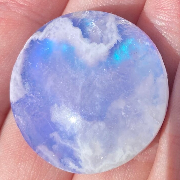 This Sky agate is a banded chalcedony, a variety of agate, This crystal is often characterized by its banded patterns, which can vary in intensity and texture.Backed with Aurora effect, each piece shimmers with a striking iridescence, evoking the beauty of a luminous sky or sea shore. Expertly crafted by a professional lapidary artist and their skilled team, every stone is cut and finished to the highest standards. Each piece is personally hand-selected, ensuring both quality and uniqueness.