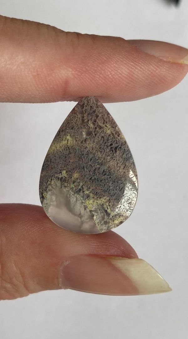 Bring a touch of nature’s tranquility to your jewelry designs with this stunning Moss Agate cabochon. Featuring intricate, moss-like inclusions suspended within a semi-translucent to milky matrix, each stone is a unique miniature landscape, no two are exactly alike. Its earthy greens/purple and subtle whites evoke the calm of a forest floor, making it a perfect centerpiece for wire-wrapped pendants, rings, or artisan creations.Expertly crafted by a professional lapidary artist and their skilled team, every stone is cut and finished to the highest standards. Each piece is personally hand-selected, ensuring both quality and uniqueness.