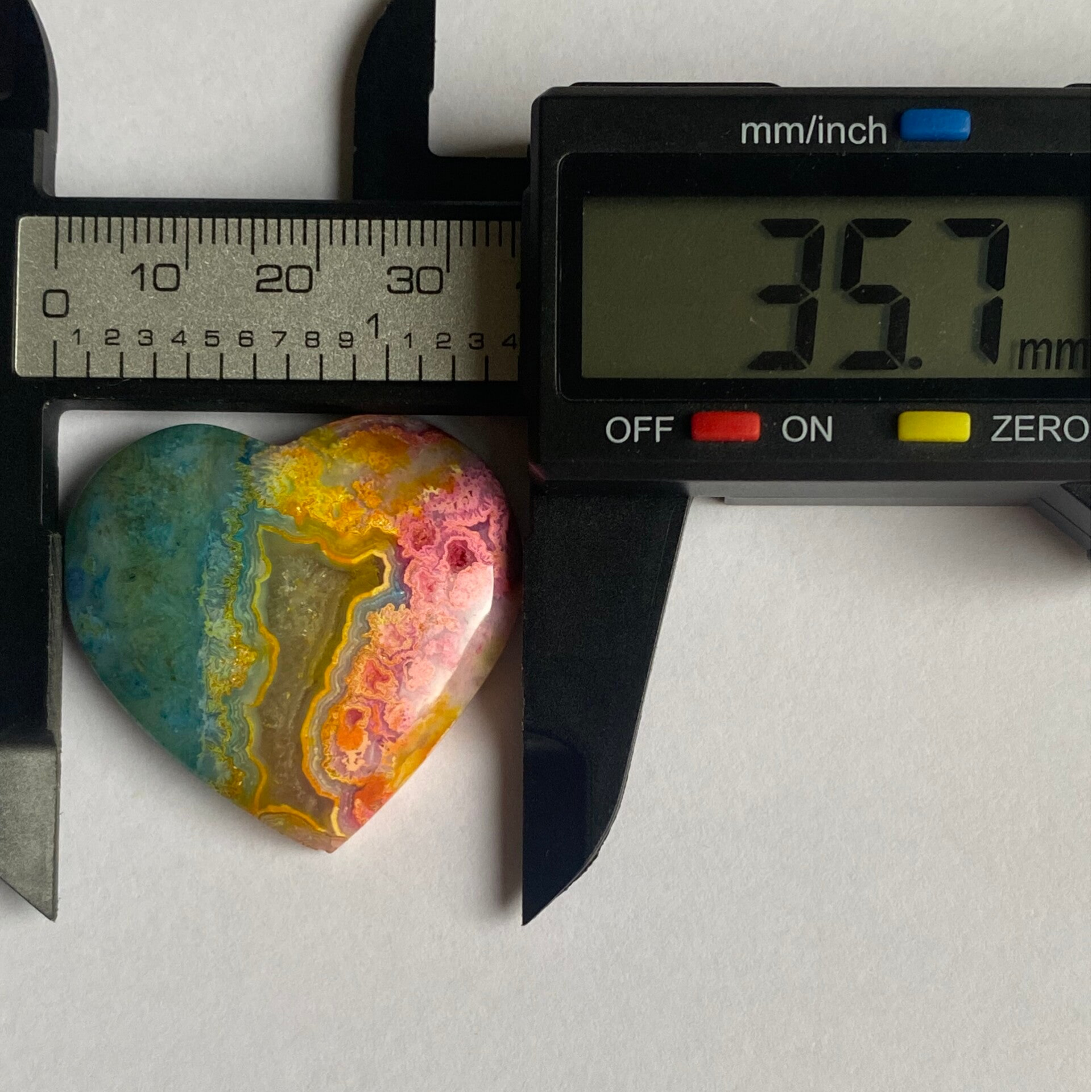 This stunning heart-shaped cabochon is carved from Crazy Lace Agate and dyed in vibrant rainbow hues that enhance its intricate lace-like banding. At its center lies a natural druzy pocket — a shimmering crystalline area that catches the light and adds dimension without any cracking or damage.