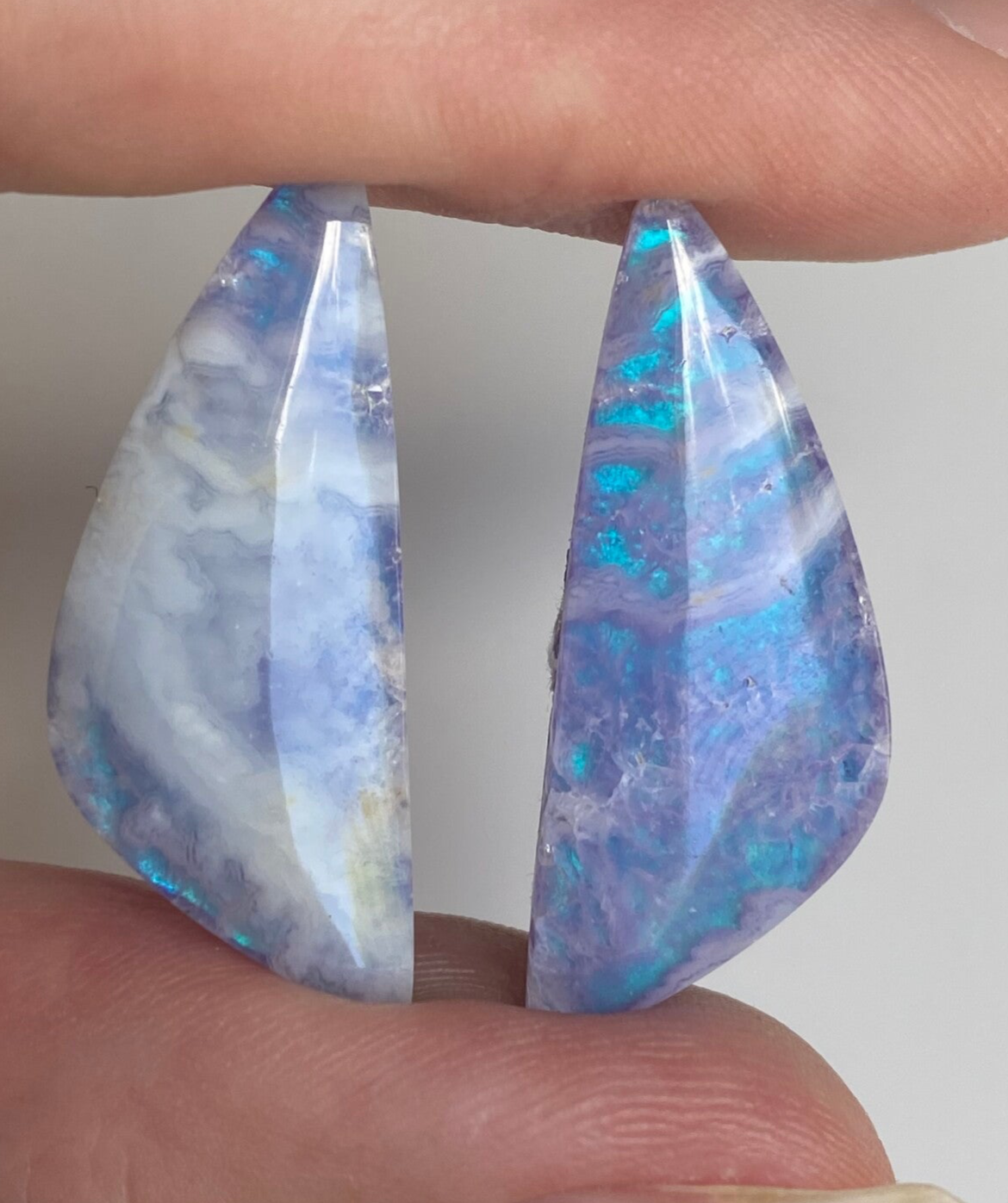 This Sky agate is a banded chalcedony, a variety of agate, This crystal is often characterized by its banded patterns, which can vary in intensity and texture.Backed with Aurora effect, each piece shimmers with a striking iridescence, evoking the beauty of a luminous sky or sea shore. Expertly crafted by a professional lapidary artist and their skilled team, every stone is cut and finished to the highest standards. Each piece is personally hand-selected, ensuring both quality and uniqueness.