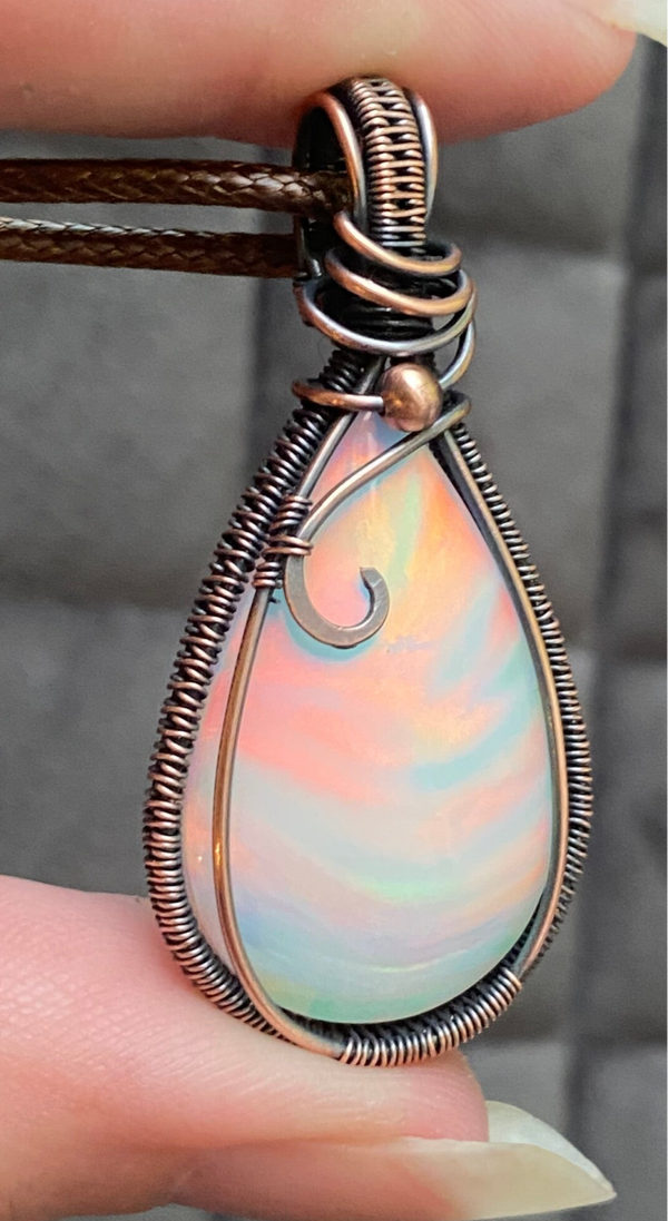 A radiant, one-of-a-kind pendant featuring an ethereal Aurora Opal, delicately wrapped in oxidized copper and weaved sides , The glowing pastel fire of the opal shifts with the light, from soft ocean blues and peachy pinks to hints of gold echoing the sky at dawn.