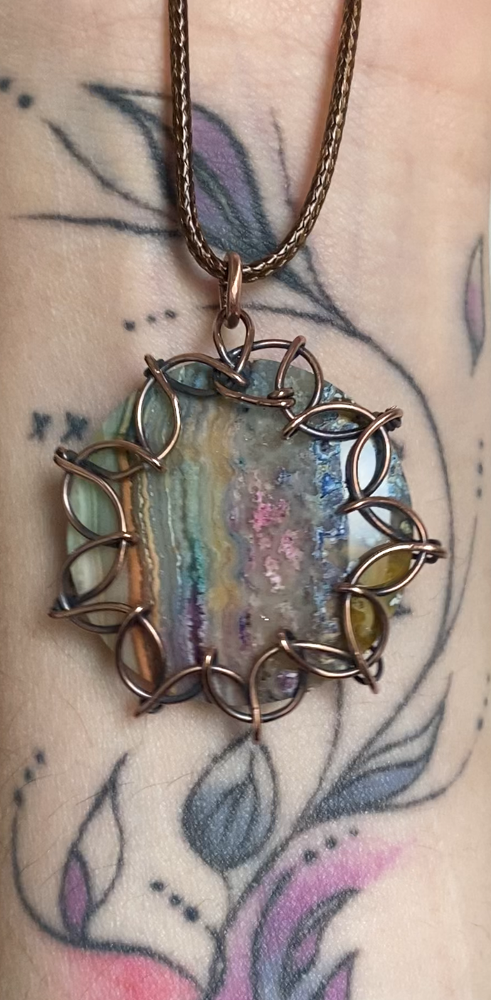 Step into a little piece of magic with this Celtic Fairy Knot pendant, handcrafted in copper and set with a rainbow hued dyed Crazy Lace Agate.