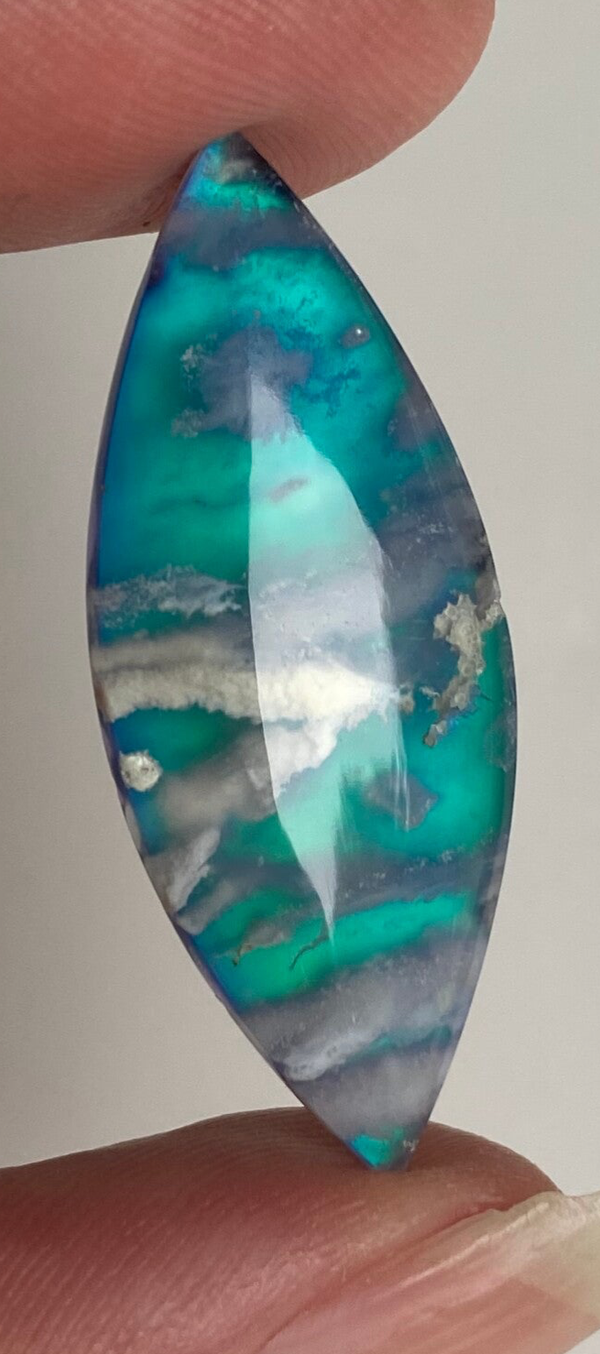 Each piece is a hand-cut Plume Fire Aurora Doublet, showcasing striking cloud-like plumes with vibrant flashes that seem to glow from within. Their ethereal patterns shift between soft sky tones and fiery highlights, giving every stone its own distinct, otherworldly beauty.