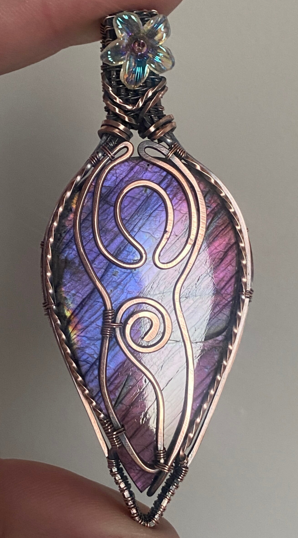 Carefully wrapped in raw copper using traditional wire-wrapping techniques, the stone is framed in an elegant goddess form and finished with a delicate flower detail at the top, adding a soft, magical touch to the design.