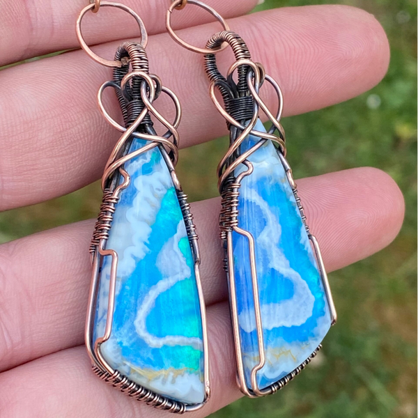 These one of a kind sky agate doublet earrings were carefully handcrafted in raw copper and then oxidized to enhance the detail and depth of the wirework.